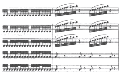 掲示板に、ちょっと意味不明の書き込みがありましたね。これは、決して「あらし」ではなく、ただ単に当事者にしかわからない内容だというだけなのですが、むげに削除をするのももったいないので、その謎解きを。「四季」というのは、「劇団四季」、ではなくて、もちろんヴィヴァルディの「四季」。春の第1楽章で、ソロ・ヴァイオリンが三連符のものすごいソロを弾く直前に、トゥッティで「ジャララララン」という上行のスケールが「2回」現れます。こんな譜面です(パートは上からVn