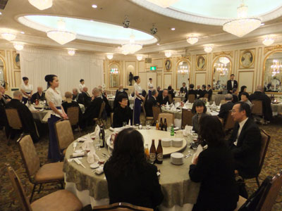法要が終わってバスでこんなホテルの宴会場に移動しました。なんと、あちこちにコンパニオンのおねえさんが立って待ち構えているではありませんか。席に座って後を見ると、持ってきた楽器や譜面台を置くのにちょうどいい机があったので、そのコンパニオンさんの一人に「ここ、使っていいですか」と聞いてみて、そこに置いておきます。私の作戦としては、食事が一段落したら、ここで楽器を組み立てて外に出て、充分に音出しをして本番に備えたかったのですね。その前には、さっきのような会場の写真などを撮るのも私の仕事です。