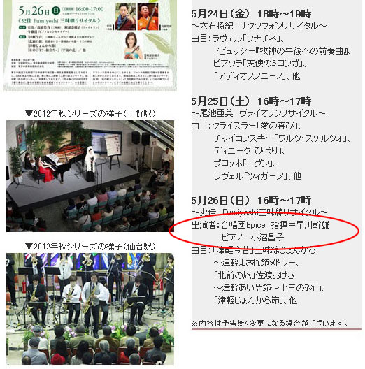 そんな、全集版の情報が、新田さんのサイトにあるということを知ったのが、Facebookだったのですね。それで、それを読みにそのページに行ったついでに、これからの演奏予定を覗いてみたら、一番新しい案内に5月の仙台駅の駅コンがあるではありませんか。確か、去年の秋の、上野駅の駅コンに新田さんは出演されていたはずですが、その流れで今年は仙台ということになったのでしょうね。