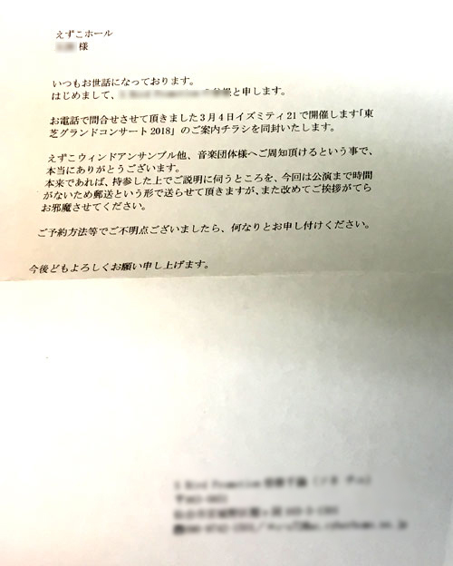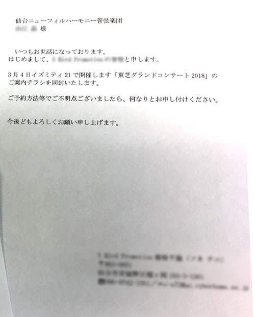「かいほうげん」は、予定通りきのう発行されました。しかも「おまけ」まで付いて。 中に挟み込んであったのは、さる外来オケのコンサートのチラシと、それを割安で入手できるサイトの案内書です。もちろん、それらは私が用意したわけではなく、ちょっと前に主催者から公式サイトのメールフォーム経由で、「団員の皆さんに配布をお願いできないでしょうか?」というメールが来て、それを実際に私の自宅まで送ってきたからです。あちらもそれほどあてにはしていないようで、それぞれ15枚がホチキスで止められていましたね。それは郵便で来たので、まあ、次の練習の時にでも持って行って机の上に置いておけばだれか持っていくだろうう、と思っていました。 そうしたら、その何日か後、こんどはレターパックで別の分厚い荷物が届きました。差出人も宛先も全く同じものだったので、前に出したのでは足らないかもしれないと、メンバー全員に渡せるぐらいに追加したのでしょうね。ちょうどいいので、これを「かいほうげん」に挟み込んでやろうと思いました。「かいほうげん」を出すことを、先方は知っていなのでしょうか? ![]() ![]() ![]() 1.宛名を「えずこホール」に直して、代わりに送ってあげる。 2.送り先に送り返す。 3.何もしないで、そのまま使う。 でしょうが、別にこの人のミスをフォローする義理なんてありませんから、迷わずに3.を選びました。もちろん、そのことはきちんとメールで伝えましたけどね。 というわけで、私の手元には100枚以上のチラシが集まったことになるので、皆さんにお配りしたというわけです。私は、早いうちに安い席を買ってしまいましたから、これは使いませんが。なんせ、イズミティなんで、高い席で聴く必要は全くありませんからね。 肝心の「かいほうげん」本体ですが、Sさんについての記事は、十分なものが出来たのでは、と思っています。まあ、あくまで私の感覚で進めたことなので、他の人にはあるいは「ちょっと余計だね」ぐらいの感想を持たれるのではないか、とは思ってますけど、そんなのは知ったことではありません。正直、これでも足らなかったな、と思っているぐらいですからね。 そうしたら、なんと、これをSさんのご遺族に渡したい、という人がいました。わたしも、できれば渡せたらな、とは思っていましたが、それこそ余計なことだと言われそうだったので、何のアクションも起こしてはいなかったのですが、そういう風に考えてくれた人がいたなんて、とてもうれしかったですね。さらには、定期演奏会の招待状も差し上げたら、というような人もいて、たぶんそれらは実現することになるでしょう。捨てたもんではありませんでした。あとは、プログラムには載せるのかどうか、という選択も迫られるでしょう。私は、載せてあげられたらいいな、とは思っていますが、どうなることでしょう。というか、それによってニューフィルの姿勢、あるいは「心」が計られるのではないでしょうか。 |
