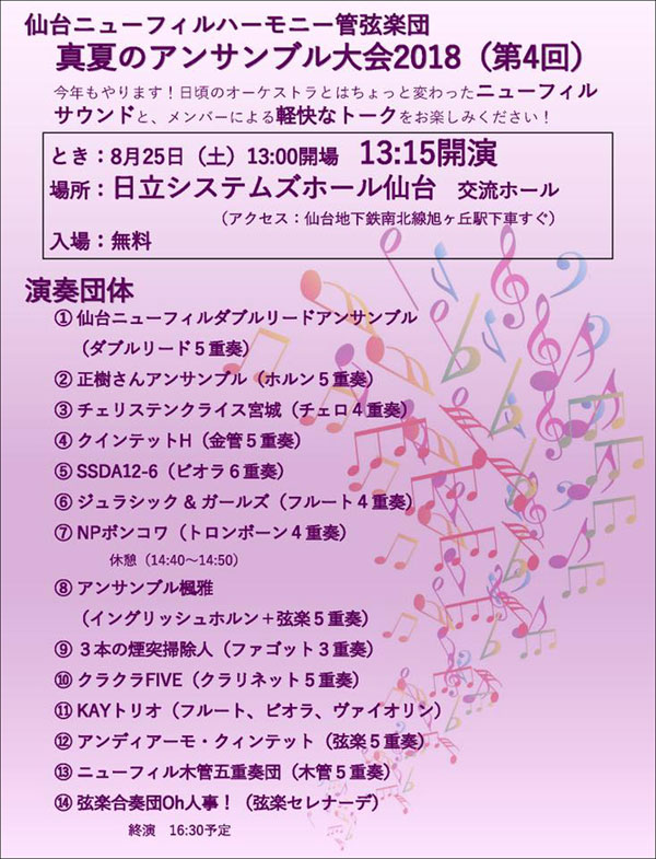 前回の禁断に使ったビアガーデンの写真、最新のネットから拾ってきたのですが、なんか見たことがあるので、去年の禁断を見てみたら、やはり全く同じ写真が使われていましたよ。おそらく、その時も画像検索で最初にあったものを使っていたのでしょう。なかなかしぶとい写真です。まあ、今年もネットでこの写真を見て、これにつられてどんなにすごい料理があるのかと期待してここにやってくるのでしょうね。実際は、年を追うごとにクオリティは下がっていく一方だというのに。今年はソフトクリームがなかったのが致命的です。 まあ、でも、今にも雨が落ちてきそうになっている空模様の中、奇跡的に最後までお天気が崩れることはなかったのは、幸いでした。なかなか充実したニューフィルの「真夏のアンサンブル大会」に「水を差されて」はいやですからね。 ![]() ![]() そうしたら、みんなも大賛成、おそらく、やってくれそうな人もいるので、その人に頼む方向で決まりです。あとで私が連絡を取ったら、すぐに引き受けてくれましたから、楽譜を作って送っておきましょう。 さらに、この曲には途中で目覚まし時計の音が入るところがあります。オケだと本物のベルを鳴らしたりするのですが、フルートだけでもここのロングトーンをフラッター・タンギングで吹けば、それらしくなるのでは、と思いついたのでこれもみんなに提案です。ただ、これは全パートに出てくるのですが、フラッターが苦手な人もいたので、それは得意な人(私も)が引き受けることで話が付きました。 それは、打楽器のSさんが、今回は打楽器パートは出演していなかったので、唯一の出番となりました。運営委員長ですからね。1曲でもやれてよかったですね。もう、本番前のリハーサルで1回合わせただけで、完璧なウッドブロックを披露して下さいました。 「外」のほうでは、ベートーヴェンのセレナードです。これも他の二人がとても頑張ってくれたので、私は伸び伸びと吹けました。最初にこのホールで弦楽器と一緒にアンサンブルをやった時に、あまりのふがいない出来がトラウマになってしまうほどだったのですが、今回でそれを払拭することが出来たようです。このアンサンブル大会は、確実に私のスキルアップにつながっています。 もちろん、演奏には結構「事故」はありました。そして、演奏以外でも大変な事故がありました。今回も私は録音と写真撮影を任されていました。特に写真は来週の指揮練の時に発行予定の「かいほうげん」に使うので、全部の出演者を撮らなければいけませんから、私が出ている時でも確実に撮れる人で、ビデオを担当していた実行委員のIさんにお願いすることにしました。 私の最初の出番が終わって引っ込むときに、そのIさんが「カメラが動かなくなりました」と青くなって私のところにやって来ました。確かに、電源を入れても何の反応もないので、もしかしてと予備のバッテリーに交換したら、無事に動くようになりました。バッテリー切れだったんですね。まだかなり残っていたと思っていたのに、意外と無くなるのは早いので、用意していて正解でした。 バッテリーが切れたのが、私たちが演奏を始める直前だったので、当然演奏している写真はありませんでした。さいわい、いつものNさんもカメラを用意していたので、そこにはちゃんとありましたから、「かいほうげん」と、Facebookページには、きちんと全グループの写真を入れることが出来るようになりました。 今日はそんなことと並行して、録音の編集もやっていました。できれば、今度の火曜日にはCDを作って持っていきたいですからね。せっかくなので、演奏前のコメントまで含めてCDに入れようと思ったのですが、そうすると曲の切れ目でCDを分けると、ちょっと2枚に収めるのは難しいことが分かりました。ですから、この際、コメントは全てカットして演奏だけを入れることにしましたので、ご了承ください しかし、みんなコメントが長いんですね。それぞれあと30秒ずつ短くしゃべっていれば、なんとか全部入れられたんですけどね。それにしても、私の声は聴きづらいですね。本人でも何を言ってるのか、さっぱり分かりませんでした。 |