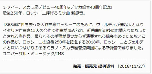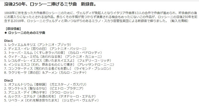 今週は月曜日が成人の日で休日ということで、その翌日は市民センターがお休み、ですから今週のニューフィルはきのうの木曜日になっていました。別に何曜日であろうが私にはあまり関係はないのですが、ほかの団員の中にはやはり都合の悪い人がいたりしますから、集まる人は少なめですね。ただ、そういう時でも管楽器ではほとんど欠席者がいないというのは、さすがですね。もちろんフルートパートは、ラヴェルを練習するときの人数4人が全部揃っていたので、始まるときには隣のホルンの席が邪魔になって座れないほどでした。 ただ、弦楽器ではかなり空席が目立っていて、その中でも、来週発行予定の新しい「かいほうげん」のためにぜひ必要な写真が欲しかった新入団員の人は、やはり木曜日は都合が悪いのか、欠席だったので撮影はできませんでした。ですから、その写真のところにはこういうダミーが入ることになるのでしょう。 ![]() ![]() そんな親切さに気を良くして、一緒にシューマイも頼んでみました。これは季節限定で今しか出していませんからね。すると、その店員さんの顔色が急に変わりました。彼女の口から聴こえた言葉は、 「実は、シューマイにもシイタケが入っているのですが、よろしいですか?」 いやあ、ここのシューマイはとてもおいしいので、ほぼ毎回頼んでいるのですが、全然シイタケの味なんかしませんでしたよ。まあ、彼女は私がシューマイを食べるのは初めてで、そこでシイタケの味がしたらまずいな、という親切心から言ってくれたのでしょうが、私にしてみれば一生秘密にしておいて欲しかったことですね。 でも、改めてそのシューマイを食べてみましたが、全然シイタケの気配はありませんでしたよ。うまい具合にほかの調味料で、いやな味をカバーしているのでしょうね。もちろん、酢豚も絶品でした。 別に秘密にしておく必要はなく、どんどん知ってもらいたいことは、いくらでもあります。きのうの「おやぢ」のアイテムに関しての、メーカーのインフォはこういうものでした。 ![]() ![]() なんて、これらはこのインフォを書いた人の単なる勘違いなのですよ。ロッシーニは「没後150年ですし」下の英文表記で分かるように、「エテルナさん」は本当は「マベッリーニさん」なのですからね。 ![]() これは、タワーレコード。 ![]() ![]() ![]() いやいや、かなりマニアックなクラシックマニアの人が店主を務めている中部地方のさる通販サイトでも、 ![]() |