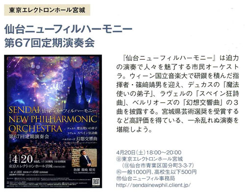 最近、登録していない番号から私の携帯に電話がかかってくることが多くなってきました。今日などは、岩沼の市外局番からの電話だったので、「来たな」と思いましたね。早速出てみると、案の定「仙台ニューフィルハーモニーの演奏会のチケットが欲しいんですが」と言ってましたね。 なぜ、そんな電話が私のところにかかってくるかというと、ついこの間こういうタウン誌にニューフィルの定期演奏会の案内を出してもらったばかりだからです。 ![]() 念のため、この方に「岩沼の方ですか?」と聞いてみたら、「亘理です」と言ってましたね。名取版でも結構範囲は広いんですね。そんな遠くから聴きに来てくれるなんて、ありがたいですね。そうなると、仙台市内のプレイガイドを紹介してもあまり意味がないので、当日券をお求めになってくださいと言っておきました。うちは前売り券も当日券も同じ値段ですから、わざわざ遠くのプレイガイドで買うことはありませんからね。 というか、全席自由ですから、別にプレイガイドで買わなくても、早めに会場の県民会館まで来て、当日券を買って並んだ方が、良い席に座れますからね。まあ、そのためには開演1時間前ぐらいには来ていただく必要があるのではないでしょうか。このところ、お客さんはほぼ1000人近くいらっしゃるようになっているので、開演直前にはこのホールを一回りするぐらいの列が出来ているようですからね。 4月に入ると、こちらは仙台で発行されているタウン誌「S-Style」に同じように案内が出ることになっています。また、電話がかかってくることが多くなるんでしょうね。 ![]() すごく響きの良いホールですから、クラリネットと、そしてゲストのヴィオラの音がとても美しく響き渡っていましたね。お客さんはニューフィル関係者だけではなく、幅広く来ていたようでした。昔のニューフィルの団員に何年ぶりかでお会いしましたが、ニューフィルにいたときより若々しくなっていましたね。 ソナタっぽいのが3曲と、アンコール・ピースという曲目ですが、共演者たちとのお話なども盛り上がって、トータルで2時間ぐらい経ってました。これだけのリサイタルが開けるだけの共演者に恵まれているのは、素敵なことですね。ちょっとうらやましくなりました。まあ私にはそんなつながりはありませんし、そもそもリサイタルなんてやる気なんて全くありませんけどね。 |