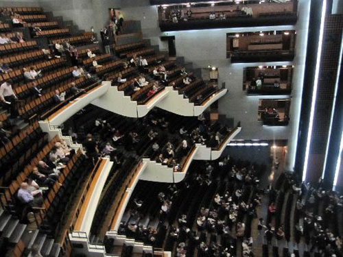 8月になってしまいましたね。このところ、仙台の気温が全国でも上位なんてことがあって、いやになります。あの東京より暑かったりするのですから、たまったもんではありません。 ということで、月が変わればこのサイトでは「コラム」も更新します。今回は「JURASSIC MUZA」ということで、この間行ってきたミューザ川崎の座席について書いてみました。なんせ、あそこは音楽専用ホールですから、どんな席を選んでもステージがきちんと見えるはずだ、と思っていたら、私が買った4階席はとんでもない席で、普通に座ったらステージの半分以上が隠れてしまっていたのですからね。特に、このホールのような「ワインヤード」のホールは、本来はそのようなポリシーで作られているものだとずっと思っていましたから、こんな席があったことには本当に驚いてしまいました。キャパシティを重視するために、無理して高いところに座席を作った結果、こんなことが起きてしまったのでしょうね。これは完全な設計ミスだと、私は思いました。 たしか、そんな、座席からのステージの見え方がこのホールのサイトにあったはずだと見てみたら、やはりこんなのがありました。 ![]() その時に、隣に座った二人連れは、「このホールはオペラハウスみたいだね」と話していたことを思い出しました。その時は、なんて馬鹿なことを言っているのだろうと思っていたのですが、彼らは、「オペラハウスのような視界だ」と言っていたのだと考えれば、納得できます。 ![]() しかし、今の時代は違います。上の写真はパリのオペラ座の昔からある「ガルニエ宮」ですが、同じオペラ座でも最近作られた「バスティーユ」では、 ![]() その点、「宮城県民会館」なんかは、どんな席に座っても決してステージが欠けてしまうことはありませんから、ありがたいですよね。3階席の一番前のバルコニーは、音もいいし最高だと思いますよ。いずれここも建て替えられるのでしょうが、間違ってもミューズ川崎のような失敗だけはしないでほしいですね。 |