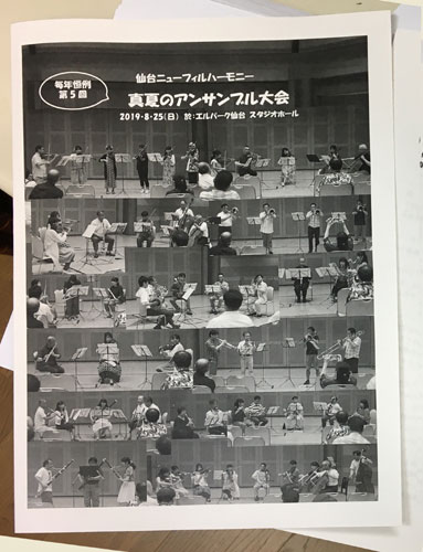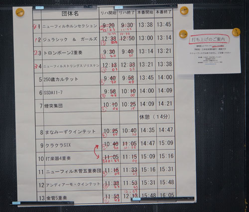 今年も、ニューフィルの「アンサンブル大会」が開催されました。正式名称は「真夏のアンサンブル大会」なのだそうです。確かに、私もこの催しもののプログラム作りを頼まれて、その表紙にそのようなことを書いていました。 ![]() ところが、今日の本番になったら、さらにその順番が変わっている、ということで、朝から大騒ぎでした。最初にリハーサルを予定していたところが、メンバーが来れなくなったのでリハをキャンセルしたために、それ以後の団体の開始時間が繰り上がってしまったのですよ。 ![]() さらに、本番になっても、さっきの団体のメンバーは会場に着いていません。どうやら、会場をこの一番町ではなく、去年まで使っていた旭ヶ丘と間違えて、そちらに行ってしまったようですね。これが、私が出る前のチームだったので、入れ替わりで私たちの出番も早くなったりしてしまいました。 そんな、裏方のごたごたはありましたが、アンサンブル大会そのものは、順調に進行していきました。 ![]() 出演者しかいないので、閑散としています。 と思ったら、弦楽器の人たちがぞろぞろと現れました。これは、プログラムには詳しいメンバーは載せなかったのですが、弦楽器のほとんどの人たちが集まって「有志」というチームを作っていたのですね。 ![]() ![]() ![]() ![]() ![]() そう、今回もCDを作るためにレコーダーを「回して」いました。火曜日の練習に持っていけるように、これから編集作業が始まります。 とりあえず、私が加わっていた演奏だけを聴いてみたのですが、まあ、思っていた通りの音が録れていましたね。 |