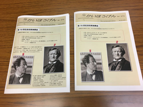明日はニューフィルの指揮者練習、そのタイミングで新しい「かいほうげん」を作っていました。ということは、今日中には印刷と製本を終わらせなければいけないということになりますね。とは言っても、きのうまでに本体はすっかり出来上がっていたので、今日はそのまま印刷すれば、完成してしまうはずでした。ところが、最終的なチェックをしようと夕べそのゲラを持って帰って眺めていたら、なんだか1ページ目があまりに手抜きのような気がしてきました。 ![]() そこで、ワーグナーのオペラを作られた順に数えていくと、なんと、この「ローエングリン」は「7番目」だったのですよ。これにはちょっと仕掛けがあって、最初のオペラを何にするかで、この番号が変わってしまうんですね。ですから、この場合は、未完に終わってしまった処女作の「婚礼」を「1つめ」と数えることにしました。実際には台本は完成していて、音楽も少しは作られていますし(録音もあります)、なんたってその出来ている部分は出版までされているのですから、これを数えないわけにはいかないでしょう。そうすると、彼のオペラを完成順に並べると、 1.婚礼(1833年・未完) ですから、見事に「ローエングリン」は「オペラ第7番」になっているのですよ。これで、全ての要素が「7」につながることになりました。 こんなことで余白を埋めて、左のような「最終稿」が出来上がった、というわけです。本当に毎回、最後の最後まで手がかかる「かいほうげん」でした。 |