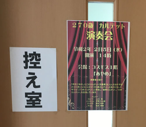 今日は、本番がありました。もちろん、フルートを吹く「本番」です。 ![]() 実は、ここはさる老人ホーム、そこから、ニューフィルのアンサンブル大会の常連、私と弦楽器の3人で結成した「250歳カルテット」に出演依頼が舞い込んだのですよ。まあ、入所者の知り合いの知り合いのようなつながりだったようですけどね。そこで、この5年前に結成されたときのネーミングをきちんと現状に合わせて修正した名前で、そこで1時間のステージを任されることになったのですよ。話が来たのがほぼ1ヶ月前ですから、それから毎週練習をしての本番ということになりました。その間に、私は必要な楽譜をそろえたり、先方のリクエストに応じて、新たに楽譜を作ったりしていましたね。 その結果出来上がったのが、こんなプログラムです。 ■モーツァルトの作品 モーツァルトは、そもそもこの話が来た時に、フルート四重奏曲をメインにしようということだったのですが、全曲はご老人相手ではちょっと辛いだろうと、1楽章だけにしました。そして、その代わりに、私は「トルコ行進曲」もこの編成の楽譜があったのでそれを提案したのですが、やってみたら他のパートがかなり難しいことが分かって、断念、その代わりに、オペラアリアの編曲版を持ってきました。 ジブリは、前にここに書いたように、弦楽四重奏の楽譜をそのまま使っています。その中に「上を向いて歩こう」も入っていたので、それを「みんなで歌いましょう」に回し、さらに、あと2曲、私が楽譜を作って演奏しました。 これに、チェロのTさんのMCを加えると、見事に1時間に収まったのですね。でも、演奏だけで正味40分ですから、これはかなりのボリュームでしたね。それを、一応お客さんの前で演奏するのですから、これは相当のプレッシャー、果たして最後まで吹ききることができるか、マジで心配でした。さらに、お客さんというのはほぼ全員車椅子で聴きに来ていましたし、中には職員さんがずっと付き添っていて、大声を出したりするのをなだめたりもしています。いちおう、レコーダーを部屋の隅にあった机の上に置いて録音してたので、そんな、演奏中の職員さんたちの気の使い方がとてもよく分かりました。正直、演奏に集中できないほどの環境なのですが、逆にそういうところだから、変に気負うことなく楽に演奏出来たような気もします。 まあ、その録音を聴き返してみると、演奏自体はガタガタでしたが、やはり生の音楽というのは何かしら普通とは違う感興を呼び覚ましたのではないか、という気は、強くします。 やはり、盛り上がったのは最後のコーナーでしょうね。正直、「上を向いて歩こう」などは楽器用の編曲なので、歌うキーに合うかどうか心配だったのですが、特に職員さんがとても張り切って歌っていましたね。この前私が耳コピで楽譜を作った「高校三年生」ももちろんウケました。これが、実際の音です。雰囲気を味わってみてください。 一応、我々は「ボランティア」という扱いでした。ですから、当然ギャラはありませんが、こんなお土産を頂きました。 ![]() |