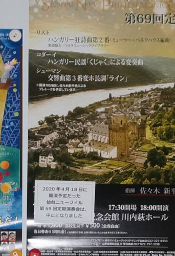 今日は、「いいこと」と「悪いこと」がありました。まず「いいこと」の方。 先日、車に傷をつけられて、その修理について加害者の保険会社に不愉快な思いをさせられたと書きましたが、その後、こんなものが私のところに届いていました。 ![]() これに署名捺印して送ったものを加害者に送り、最終的に承諾も得られたので示談が成立した、と、今日電話でその保険会社の担当者から連絡があったのですよ。まあ、言いたいことはたくさんありましたが、あえてそれには触れず、「お世話様でした」と言って電話を切りました。ということで、この件はこれで解決されました、というのがとりあえず「いいこと」なんでしょう。 そして、「悪いこと」です。 きのうから、ニューフィルの練習がお休みになっていますが、それがあと1週間は続くことになっています。そして、その先はどうなるかということが、全く誰にもわかりません。しかし、すでに4月に行われることになっている演奏会のチラシは公開されていますし、チケットも出回っていますから、もし演奏会が中止になることになれば払い戻しなどの作業が必要になってきます。というか、私が企画書を送ったタウン誌からは、その時一緒に送ったプレゼント用のチケットをこのまま使ってもいいものか、と、電話をもらったのですよね。一応、「今回は見送ってください」とは言っておきましたが、もはや何か手を打たなければいけない時期になっていることを実感しました。 実際、今の状態ではとても4月に演奏会を開くことなんで出来るわけがありませんから、そのあたりをきちんとしてほしいと、団長や技術委員会にあててメールを送りました。 そうしたら、団長からは、「そこまでは考えていなかったので、さっそく手を打つ」という返事があり、とりあえず広報活動とチケット販売を当面見合わせるというコメントが出されました。ま、私はすでにそれを実行していましたけどね。さらに、今回のコメントを受けて、公式サイトのチラシの画像を削除し、Facebookページのカバーも差し替えました。 そのメールの中で、ちょっと気になることも分かりました。仙台市の施設利用予約のサイトには、今こんなお知らせが掲載されています。 ![]() まあ、こうなっては、もはや春の演奏会は中止しかないのではないでしょうかね。 |