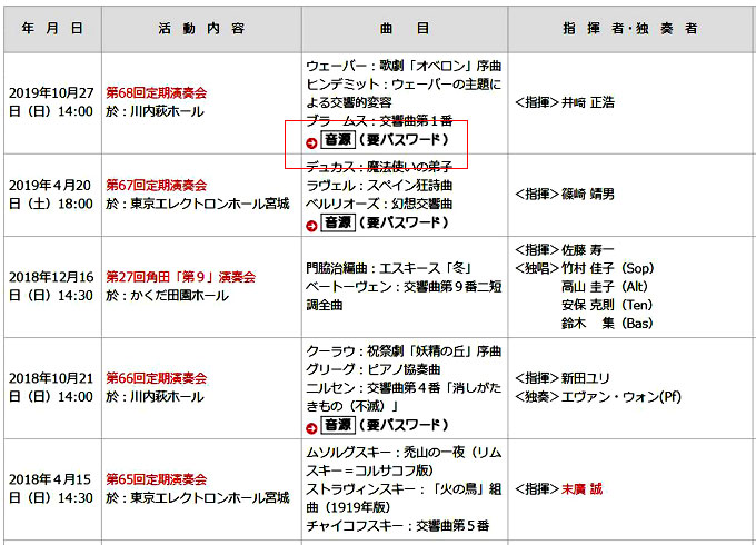 この間のタケノコ掘りの時にHさんからいただいたのは、ニューフィルの創設の時から現在までのほぼすべてのコンサートの音源でした。いや、音源そのものはやはりHさんが作ったCDになっているので、聴くことはできるのですが、やはり数が多いので何かちょっと聴きたいときには探すのが大変でした。それを、すべてmp3に直して、手軽に聴けるようにしてくれたのですよ。 ですから、私はそれをもっと聴きやすくするために、公式サイトにある今までの演奏会をまとめたページから、その音源がリンクできるようにしてみたいと思いました。インターネットで音源を再生させるのは、例えばフラッシュ・プレーヤーとか難しいものがありますが、単に1つのファイルになっているものを聴くときには、その音源ファイルに直接リンクを張るだけで、適当な再生プレーヤーが起動して音を聴くことが出来ます。ですから、その音源ファイルをサーバーにアップさえしておけば、簡単にそれをネットで聴くことができるようになるのです。 ですから、そのためにはサーバーの容量がある程度なければいけません。私が使っているレンタルサーバーは、月額100円(+税)で10GBまで使えるというものでしたが、すでに半分ぐらいは使っているので、あまり空きがありません。ニューフィルの音源はmp3に圧縮してあっても全部だと6GBぐらいありますから、ちょっと厳しいんですね。ですから、この際もうワンランク上のサイズに変えることにしました。それだと、料金は2.5倍ですが容量は5倍になって50GBまで使えるようになります。常々、ニューフィルの演奏会のハイレゾ音源と、写真を一緒に入れるとほとんど満杯になってしまうので、増量を考えていたのですが、この機会にランクアップすることにしました。 これで、伸び伸びと音源を使えると、張り切って作業を始めたのですが、手順を進めていくうちにいくつかの問題が出てきました。まず、頂いた膨大なデータは、そのままではインターネットでは使えないような形になっていました。それは、ファイルの名前です。インターネットの世界では、ファイル名を付けるのにも様々な制約があって、ちょっと不自由なところがあります。基本は半角の英数字しか使えませんが、そこで大文字と小文字の違いまで厳しくチェックされてしまうのですよ。例えば、画像ファイルの拡張子の「.jpg」ですが、これは大文字の「.JPG」でも問題なく使うことは出来ます。ところが、同じ画像で「image.jpg」と「image.JPG」と、拡張子だけを大文字に変えても、普通は同じように扱えるのですが、インターネットの場合は全く別のものとされてしまうのですね。なぜか、デジカメのデータなどは「.JPG」になっているので、注意が必要だということを、最近知りました。 あとは名前そのものも、間にブランクがあればファイルとして認められませんし、ドット(.)やスラッシュ(/)は別の意味を持ってしまうので使うことはできません。というわけで、直接デバイスに取り込んで聴く分には何の問題もないのですが、それをインターネットで扱うためには、多少修正が必要なのでした。 それと、ファイルはシンフォニーなどは楽章ごとになっていましたが、これも、いちいち切り替えるのは面倒だ、という人のために、全楽章を1つのファイルにまとめて、続けて聴けるようにしてみました。つまり、一つの曲がいくつかの部分に分かれているものは、「全曲」と「楽章ごと」の2種類のファイルを用意しています。 そんなわけで、一度手順が決まってしまえば、あとは単純作業の繰り返しですから、時間さえあれば仕事は出来上がります。今日だけで最近の3つの定期演奏会と、オープニング・コンサートから第3回定期演奏会までのファイルがリンクできるようになりました。そんな風にして、前と後ろから順次作業を進めていくつもりです。 ただ、これはあくまで関係者向けのサービスですから、そのファイルにはパスワードをかけています。まあ、ニューフィルではいつも使っているIDとパスワードですから、それを使ってください。 ![]() |