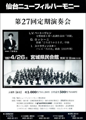 いつの間にか「4連休」などというものが出来ていたので、とりあえず暦通りに休みを取りました。その連休のコンテンツの一つが、「東京オリンピックの開会式」をお祝いする日だったということも、今になって分かったのですから、なんだか不思議な気がします。だったら、これからは今までの10月の「体育の日」の他にもう1回7月にスポーツ関係の祝日が増えるのだろう、と思ったら、実はこれは単に今までの「体育の日」が改名しただけのことだったのですね。つまり、今回のオリンピックの開会式はかつての10月から7月に変わってしまったので、祝日もシフトさせた、ということのようですね。 でも、その日には開会式は行われないということはだいぶ前に決まっていたのですから、そんな日に休むことに何の意味があるのだ、という気もしますよね。何の意味もないのに、決まっていることだと言って突っ走るのは、この国の人たちの悪い癖です。 でも、そんなにお休みがあったので、このところの懸案事項の、ニューフィルのサイトの整備に時間をたっぷりとることが出来ました。これまでは全ての定期演奏会プラスアルファの音源を直に聴けるようにする、という作業に邁進していたわけですが、それもほぼ完成間近になっています。 それをやっている過程で、初期のころの演奏会の音は聴けるようにはなったのですが、チラシなどがアップされていないものがあることに気づきました。公式サイトが出来たのが20年ぐらい前になるのですが、それ以前のものは文字情報だけで、チラシなどは見られなかったのですね。私がニューフィルに入ってからは、そういう資料は全て保存してありますから、とりあえずチラシだけをスキャンして、アップしてみました。これは、別に認証も必要ありませんから、公式サイトから「歴史」を開いて、演奏会のタイトルをクリックするとチラシのあるページが開くようになっていますから、ご覧になってみてください。 そんな中から興味あるものを少しご紹介しますね。 ![]() ![]() ![]() この中にあるもっとも古いチラシがこれです。私がニューフィル・デビューをした時です。 ![]() |