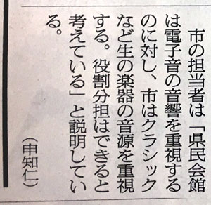 どうやら、仙台市が作るコンサートホールの具体的な建設場所がほぼ確定したようですね。「せんだい青葉山交流広場」という、今では駐車場になっているところです。かつては、サンドウィッチマンの母校の仙台商業高校があったところで、サンドが卒業した後に七北田に移転したんですね。 それを伝える今日の朝日新聞の記事です。 ![]() ということで、宮城県でも今の県民会館(東京エレクトロンホール宮城)を別の場所に建て替えるという方針を決定したというのですから、「音楽ホール」が2つもできることがほぼ確定したということになりますね。これでやっと、仙台市も遅まきながら、他の大都市並みのちゃんとしたホールを持つことが出来るようになったなあ、ずいぶん長く待たされたなあ、と喜んでいたのですが、この記事の最後を見て、愕然となりました。 ![]() とりあえず、「電子音の音響」というあたりからツッコませていただくと、この人の頭の中には「電子音の音響を重視する音楽」というものが具体的にあるのでしょうね。私あたりが「電子音」と言われて思い当たるのは、シンセサイザーやコンピューターで作り出す音しかありません。ですから、そのようなもので作られた音楽だと、クラフトワークとかYMO、まあ最近ではパフュームとか、そういったアーティストが連想されますね。「テクノ」ってやつですか。 しかし、おそらく「市の担当者」さんは、「県民会館はテクノのために作る」という意味で言ったのでは絶対ないでしょうね。ここで言う「電子音の音響」というのは、100パーセント「PA」のことに違いありません。なんたって「生の楽器」の対語として登場しているのですからね。なんでしたら「マイク」と言い換えてもいいかもしれません。要は、生音をマイクで拾って、それを「電気的」に増幅してスピーカーから流す、というシステムのことです。そこには「電子」という言葉は入ってはきません。いや、実際は最近はアンプもデジタルですし、エフェクターなどでは「電子的」な処理も行われますから、細かいことを言えば「電子」も関与はしているのですが、それはまだ一般的な概念ではありませんから。 結局、かなりの確率で、「市の担当者」さんは、「県民会館はPAを使う音楽のための音響を重視する」と言いたかったのでしょうね。具体的には、残響があまりないホール、ということになりますね。要は、どこにでもある「多目的ホール」ですよね。 ですから、仙台市が今度作ろうとしているホールは「生の音源を重視」する、紛れもない音楽専用ホールになる、と言いたかったのでしょう。ただ、それだけでは、仙台市にサントリーホールと同じものが出来るということにはなりません。「生の音源を重視」すると言っても、そういう音楽の中にはサントリーホールではできないものがあります。それは、例えばオペラのような舞台芸術です。コンサートとオペラでは、必要とされるホールの機能が全く違っているのですよ。その違いは、まずプロセニアムがあるかないか、そして、バックステージの広さです。オーケストラの音響を重視したコンサートホールにはプロセニアムはありませんし、オペラハウスでは場面転換などでバックステージを広くとる必要があります。 つまり、「音楽専用ホール」には、全くコンセプトの異なる2種類のホールが存在するのです。そして、「文化的」と言われる都市は、そのどちらも持っているものなのですよ。札幌市だと「Kitara」と「Hitaru」、金沢市だと「県立音楽堂」と「歌劇座」でしょうか。東京都では同じ敷地内に「東京オペラシティコンサートホール」と「新国立劇場」がありますよ。「市の担当者」さんのコメントからは、そんなヴィジョンは全く感じられないのが情けないです。 ただ、このコメントは「河北新報」には載ってませんでした。 |