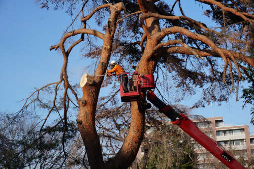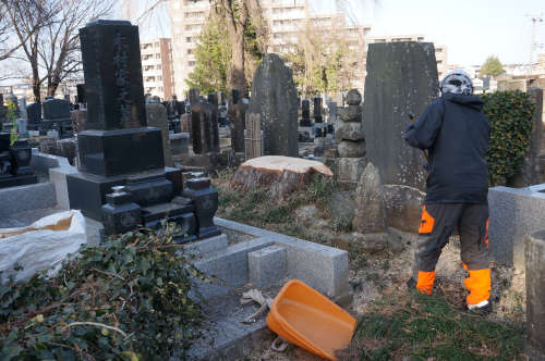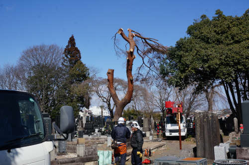 職場には、たくさんの樹木があります。なんせ、天然記念物の「マルミガヤ」なんてのもあるぐらいですからね。これからだと、桜の木が見ものですね。ピーク時には一斉に花が咲いて、わざわざこれを見るためだけにやってくる人もいますよ。 ただ、中には、もはや命を終わらせるような樹木もあります。そんな桜の木に囲まれてひときわ立派な枝ぶりを誇っていた松の木が、最近害虫のせいでほとんどの葉が枯れてしまっていました。 ![]() それで、まずは出入りの植木屋さんに見積もりを取ってみたら、これだけの枝が墓石に当たらないように切るには、松の木の周りに足場を組んで作業をする必要があるということで、何百万円もの費用が掛かることがわかりました。えらいことですね。 ただ、それ以外にも実際にこの辺りの伐採をお願いしたことのある業者もいたので、そこにも見積もってもらったら、そちらはクレーン車を入れて作業を行えば、80万円ぐらいで出来る、ということでした。そこは、何回も現場に来てくれて、間違いなくそれで出来るということだったので、お願いすることにしました。 そして、昨日からその作業が始まりました。 ![]() ![]() ![]() ![]() ![]() ![]() ![]() ![]() |