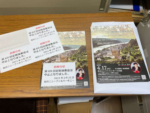 仙台市のコロナウィルスワクチンの接種方針が決まったようで、これまで4月以降の予約が凍結されていたすべての市民センターの中から、15の施設だけが使われることになったそうです。その中には、ニューフィルのいつもの練習場も含まれていたのですが、それらはすべて使われるのは土日と休日だけで、平日は普通に借りられるようになりました。まあ、これで、ほぼ以前と同じ条件で借りることができることになったので、まずは、楽器倉庫の問題などは解決したことになりますからよかったですね。もちろん、感染がさらに進んで、施設そのものが使えなくなるという可能性がこれでなくなったということではありませんよ。 とりあえず一つの課題はクリアできたところで、昨日の旭ヶ丘での練習の前には、久しぶりに「とらの子」でご飯を食べました。相変わらずおいしいお米を堪能して、車を置いてきた駐車場へ向かいます。それは、坂道沿いにかなり歩いたところにあります。ちょうど真ん中辺に来たあたりで、後ろから「お客さま!」というような声が聞こえてきました。振り返ると、そこにはさっきのお店の店員さんがスマホを片手に立っていました。「これ、お客様のお忘れものではないでしょうか?」ですって。確かにそれは私のスマホ、うっかりしてテーブルの上に置いたままで会計をして出てきていたんですね。それを発見した彼女は、全速力で登りの坂道を息を切らせながら走ってきたのでしょう。もちろん、わたしは「こんなところまで、わざわざありがとうございました」と、丁寧にお礼を言いました。 それが縁で、彼女と私とはお付き合いを始めるようになりました。 ![]() 昨日の練習では、やっとチケットやチラシを訂正するシールが渡されました。ご存知のように演奏会の日程や会場が変わってしまったので、それを貼り付けて訂正しなければいけないのですよ。チケットはともかく、チラシは今回もいらないだろうと思っていたのですが、いつの間にか大量に印刷することになってしまっていたので、仕方なくいつも通り市民センターには全部配布するというにしてしまいました。ただ、その際にポスターはなくして、チラシも今まで50枚ずつだったものも30枚に減らしています。その担当をお願いした人たちにも、シールをもっていってもらって各自貼り付けてもらうことになりますね。ご苦労様です。こんなことになるのなら、チラシも配らないようにしておけばよかったのですが、それを決めたときはちょっとそんな雰囲気ではありませんでしたからね。 とにかく、自分が蒔いた種には違いありませんから、今日はほとんどそのシール貼りで過ごしました。 ![]() ![]() しかし、やっているうちに、シールのサイズがかなり違っていることに気づきました。これよりもっと上下の幅が広いのがあって、それだと下のチケット代の上が少し欠けると同時に、上の赤い線も完全に消えてしまいます。 ![]() それと、予想通り、プレイガイドで余計なところを消すことはできませんでした。その件は、公式サイトではちゃんと断ってあります。リンクしてあるPDFではマジックで消しておきましたけど。 まあ、それでもチラシ600枚、チケット100枚を、全部貼り終わりました。その中には、「友の会」への発送分もあります。ただ、それを発送する時に、出来れば今回の一連の出来事を記した新しい「かいほうげん」を入れたいので、それをまず作ってからですね。来週中には出来上がるように、鋭意準備中です。 |