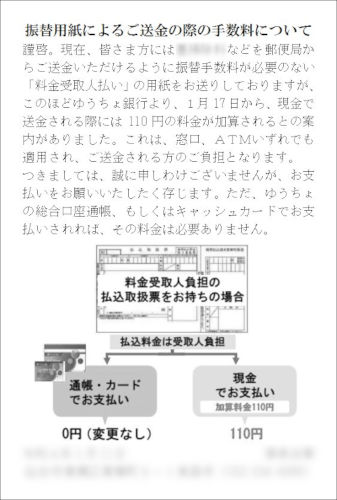 正月休み明けには、年末に届いていた郵便局の振替による送金の整理に明け暮れました。これは毎年のことなので、去年のうちにかなりの量の整理を行っていたのですが、そんなことをやっていても、しっかり仕事は残っていましたよ。最終的にそれらを何度も集計して社長のところに提出したら、「3000円足らない」などと言い出したので、確認してみたらあちらの数えミスでした。 そんな中で、ニューフィルの初練習は木曜日(ハッピーマンデーの週は、変わります)の木管分奏です。まだまだお正月気分が抜けない中の練習ですが、2週間ぶりということで楽しく吹けました。途中で、ベートーヴェンの第2楽章でベーレンライターならではの、現行版とは違っているところを発見、あとで、持っていたヘンレ版を見てみると、そこは現行版と同じでした。ベーレンライター版の校訂報告を見ると、やはり資料によって異なっているようですね。これは初版の形、指揮者はどのようにするのか楽しみです。 その練習が始まる前に、会計担当のSさんからちょっとした情報を教えてもらいました。それは、郵便振替で、現金で支払いをするとその際に手数料がかかるようになるのだ、ということです。そんなこと、全く知りませんでしたよ。しかもそれが実施されるのが1月17日だというのですから、焦りますよね。つまり、先ほどの振替では、受け取る側が手数料を払っているので、出す側は普通に必要な金額だけを送れば済むのですが、今回の改正は、送る側が、その手数料(110円)を払わなければいけないというのですからね。そうなると、カスタマーにも、そのことを連絡しておかなければいけませんし。 そこで、確実な情報を得るために、ゆうちょ銀行の振替担当の部署に電話をかけてみました。まず知りたかったのは、そのような改正がいつ告知されていたのか、ということです。ところが、最初に電話に出た人は、それは自分ではわからないので、詳しい人にかけさせるから、少し待っていてくれ、ということでした。でも、電話を切ってしばらく様子を見ていても、電話は一向にかかってきません。そして、もう忘れかけたころに、やっとかかってきましたよ。それによると、この件は昨年の7月2日に発表されていて、メディアでも公開されていたのだそうです。あとは、チラシを郵便局に置いてあったのだそうです。ただ、今までだと、なにか変更されることがあると、直接職場に文書が届いていましたから、それを尋ねると、そのようなことは一切やっていなかったというではありませんか。それは困りますね。現に、私の職場では年間1000件近くの振替での送金を受け付けています。そんな「顧客」に何の挨拶もなかったとは。そのせいで、私は今までそのことを全く知らなかったのですからね。発表された後でも何回か郵便局にはいきましたが、そんなチラシは全く気付きませんでしたよ。 これは重大なミスです。つまり、もっと早くこのことを知っていれば、年末に送るDMで一緒に知らせることが出来たのに、ここで改めて1月17日に間に合うように連絡しなければいけないじゃないですか。もちろん、そんなこと言ったって、ゆうちょ銀行がはがき代を出してくれるはずもありませんね。 それ以前に、その電話の相手は、その料金の支払いについてちょっと突っ込んだ質問をしてみると、それは、カスタマーズセンターに問い合わせてくださいなどと言い出すので、もう私は完全に切れてしまいました。自分の仕事の業務内容を知らないなんて、信じられません。もうそれからは私は罵倒の嵐です。常々気になっていた、ATMで送るときに住所氏名を書かなくても届いてしまうという欠陥についても、言ってやりましたよ。相手は震えあがって(見えませんが)、しおらしく「上のものに伝えます」ですって。そんなことで改善できることは期待できないと言ったら、苦笑いを浮かべていましたね(これも見えません)。 そこでハタと気づいたのですが、今回の振替の量がいつもよりかなり多かったのは、このことを知っている人がいて、それで料金を払わなくても済むうちに送ってしまおうと思っていたのではないでしょうかね。現に、さきほどのSさんも郵便局で教えてもらったそうですから。 いずれにしても、これを知ってしまったからには、カスタマーにそのことをきちんと教えて、お願いもしなければいけません。それで、こんなはがきを作ってみました。 ![]() |