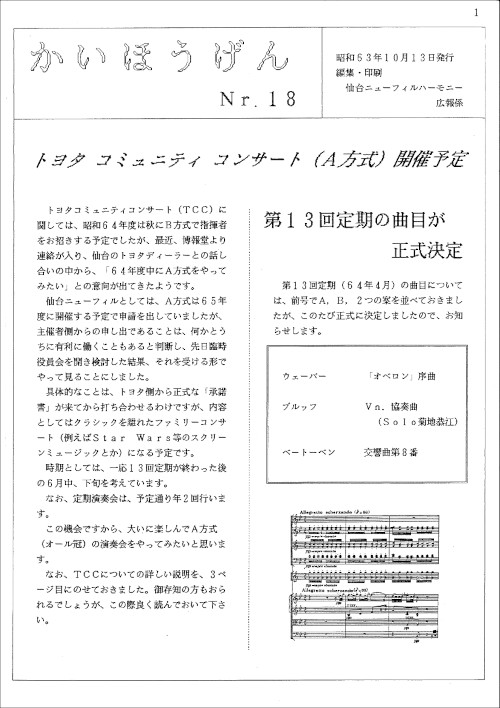 前回の時点での「かいほうげん」のリマスター版は21号まででしたが、それからもチマチマと作業を進めた結果、40号までの修復が終わりました。なんせ、オリジナルは30年以上前に作ったものですから、紙にコピーしたものはもう用紙が黄ばんできていたりしますからね。原版の方は、いちおうクリアファイルに保存してあったので、散逸したりはしていませんでしたが、物によっては写真だけなくなっていたりするものもありましたね。仕方がないので、そこはその抜けた写真はコピーの白黒版をもう一度コピーして貼り付けておきました。ですから、今回のカラー版PDFになると、もうその違いは歴然としてますね。 ![]() さいわい、指揮者練習や本番とか打ち上げの写真はちゃんとしていましたから、それらは全てカラーで見ることができるようになるはずです。たとえば、末廣さんが初めてニューフィルの前に立った時の写真が入った、ページの一部がこれです。 ![]() こんな感じで、初期のものをスキャンしてPDFを作る作業は時間さえあればすぐに出来るので、おそらく日々進捗していくことでしょう。この頃のニューフィルの様子がよく分かりますから、パスワードが分かる方は是非ご覧になってみてくださいね。 今日は、朝届いた新聞の広告にとても面白い広告があったので、それをまず写真に撮ってFacebookにアップしておきました。みんな、大爆笑だったようですね。ですから、ここではそれをきちんとスキャンしたものを載せてみましょう。 ![]() でも、本当に面白いのは、そのキャッチコピーですよ。これだと、”歓喜の歌”が「人類」を生んだということになってしまいますよね。念のため、このオーケストラのサイトを見てみたら、コピー自体が別のものでした。ですから、これは新聞広告を作った代理店のせいだ、ということになるのでしょうね。こういうミスは、大好きです。 |