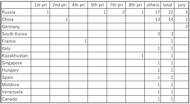 6月19日からロシアのモスクワで開催されていた音楽コンクールが、29日に終了しました。よくこんな時にコンクールなんかできるなあ、と、まともな感情の持ち主なら思ってしまうはずですが、そもそも、この国がこんなでたらめな戦争を始めたこと自体が、まっとうな人間としてはあり得ないことなのですから、もう、何でもあり、なんでしょうね。つまり、俺たちは間違ったことはしていないのだから、コンクールもその時期が来れば予定通りに開催することに、なんの問題もない、という開き直りの結果なのでしょう。 その模様は、最近のコンクールの常で、しっかりネットで配信されていたようですね。とても立派なウェブサイトも作られていますから、これだけ見ればこの国はなんと平和な国なのだろう、と思ってしまうかもしれませんね。いや、それこそが、このコンクールを開催した最大の目的なのでしょう。 ですから、いくら「音楽に国境はない」とか、「音楽は全人類のものだ」と言ってみたところで、こんなコンクールにはこれっぽっちの価値もないことは明らかです。というか、このコンクール自体が、そもそも「国際コンクール」である資格を剥奪されているのですから、たとえこのコンクールで優勝しても、その優勝は世界的に認められることはないのですからね。 そんなコンクールがどんな結果に終わったか、そのウェブサイトをもとに、各部門ごとのコンテスタントと審査員の国別の一覧表を作ってみました。 ■ピアノ部門 ![]() ■ヴァイオリン部門 ![]() ■チェロ部門 ![]() ■声楽部門 ![]() ■木管楽器部門 ![]() ■金管楽器部門 ![]() 大急ぎで作ったので、ミスがあるかもしれませんがそこは鷹揚に。 いったい、これのどこが「国際コンクール」なのか、と思えてしまいますね。これは単なる「国内コンクール」。ロシアの醜さをさらに印象付ける結果になっているのではないでしょうか。 (7/2追記) チェロ部門の画像が間違っていましたので、訂正させていただきました。 |