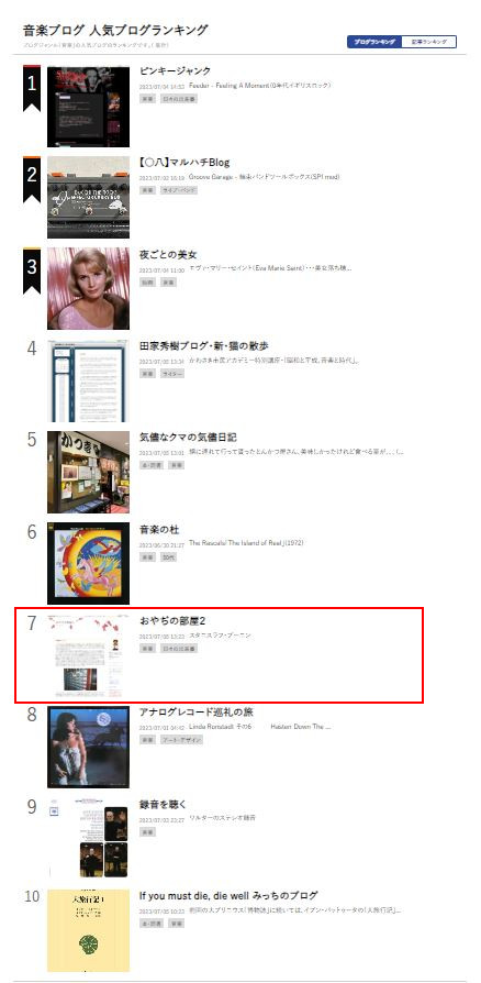 私は、この「禁断」と、もう一つのコンテンツの「おやぢの部屋」を、私のウェブサイトに書いた後、そのままブログにコピペしています。そのブログは、もちろん、自作ではなく、出来合いの「エキサイトブログ」というのを使っています。こういうサービスはたくさんありますが、この「エキサイト」の利用者数はどうやらランキングでは6番目のようですね。最高位は「アメーバブログ」いわゆる「アメブロ」ですね。ただ、私は、ここのデザインが最悪だったので、ここだけは使いたくなくて、エキサイトにしました。あとで、ピアニストのOさんもここを使っているのを知って、ちょっと意外でしたけど。 そのエキサイトでは、ジャンル別のランキングというものがあります。前もって、自分のブログのジャンルをいくつか選んで登録しておくと、そのジャンルの中で何位なのかというのが、毎日分かるようになっています。私の場合は「音楽」と「日々の出来事」という2つのジャンルを選んでありました。 その「音楽」では、大体20位以内には入っていて、まあまあだな、と思っているのですが、たまにそれが一桁になったりすることがあって、驚かされたりします。最初に「7位」になったのが、2014年の4月、その証拠がこちらです。 ただ、それはその時1回きりで、あとは高い時でも10番台、普通はまず20番台から30番台をうろうろしてますね。 そうしたら、久しぶりに、先日その最高位のタイ記録に達しました。 ![]() ![]() 何よりうれしかったのは、ここで「10位」になっているブログよりも上になったことです。常日頃、このブログがこんなに上位にあることに疑問を持っていましたからね(単なるひがみですけど)。 ただ、これは1日だけの話で、次の日になったらいつもの10位台に戻っていましたけどね。次にここまで上がってくるのは、何年先のことでしょう。 ただ、「ブログ」そのものの人気は、もはやピークを過ぎているのだそうです。すでに、このサービスを停止したところもあるようですし。それはそうでしょうね。いまでは、もっと手軽なSNSがネットを席巻していますからね。でも、そのサービスもこのところ騒がしくなっているようで、のめりこんでしまうと足をすくわれそうで、怖いですね。 |