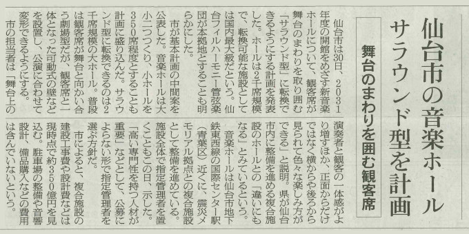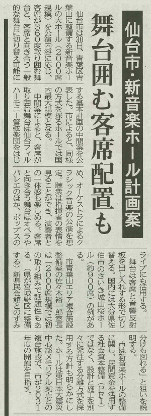 10年前に、私はこんなことを書いていました。それが、最近になって、遅まきながら具体的な動きが出てきたようで、きのうあたりはコンサートホールとしてどんなものが作られるのか、という案が提案されていましたね。それは、新聞や、地方局のニュースによって広く報道されたので、ご存知の方もいらっしゃることでしょう。 まずは、それを伝える新聞記事、河北新報です。 ![]() ![]() どちらの記事も、ステージのまわりを囲むように座席が配置される、というようなことと一緒に、その配置を変化させて、舞台芸術用にプロセニアムを設置したステージに変えることもできるのだ、ということが書かれていますね。なんか、すごいものが出来そう、という気がしてしまうのですが、ただ読んだだけではいまいちそのイメージがわかないのではないでしょうか。 そこで、河北の記事にある、「さいき城山桜ホール」というところが実際にどんな風になっているのか、確かめてみました。 ![]() ![]() ![]() つまり、このホールでは、これまで一般的だったいわゆる「多目的ホール」で採用されているプロセニアムと、コンサートホールで使われていたシューボックスのどちらのモードにもなってしまう、という構造を持っているのですね。確かに、私は今までさんざん国内、国外のホールに実際に行ったり、写真を見てきましたが、こんなことができるホールなんて見たことがありませんでしたよ。 どのようにして、それを可能にしたかというと、ステージの上は、普通の多目的ホールのように上に広がる空間(「フライズ」と言います)があるのですが、そこにプロセニアムの壁もぶら下がっているのですね。一番下の写真では、それは見えませんが、それは、ステージの上の天井も実は上からぶら下がっていて、プロセニアムが必要なときは、それが2枚に分かれて垂直になります。そして、開いた天井の部分から、この写真だとピアノと客席の間あたりにプロセニアムが降りてくるのですよ。同時に、ステージの上手と下手の壁が後ろに折りたたまれて袖が開き、前の部分の一部は内側に向けて折られます。そして、その上にプロセニアムが乗っかり、一番上の写真のようになるのですね。 いやあ、すごいものが出来ていたのですね。ホールのオタクとしては、とても興味深いものです。すごいですね。これよりももっと規模の大きいものが、それこそ「日本で初めて」仙台市に出来るんですよ。興奮しますね。 と、あくまで建築的にはすごいなあ、とは思うのですが、でも、なぜそこまでしなければいけないのか、という疑問は残ります。「音楽ホール」としては、そんなことなどしなくても、このシューボックスのままでいいじゃないか、という疑問ですね。というか、私にとっては、音楽ホールというのは、サントリーホールやミューザ川崎といった、ワインヤードと、東京オペラシティのようなシューボックスのどちらかを指し示すイメージしかありませんでした。プロセニアムというのは、あくまで「オペラ」に特化したホールなんですよね。 ですから、本当にそれが分かっている人たちは、コンサートホールとオペラハウスを別々に作ります。さっきのオペラシティが、まさにそのような実例ですよね。札幌にだって、KITARAというコンサートホールとHITARUというオペラハウスがあるじゃないですか。なぜそうしたか、というと、同じ音楽ホールでもその2つは、もちろん、ステージの構造が全く違いますし、さらに音響設計でも全く別のことが要求されるからです。残響時間とか。 私も、かつて、ニューフィルの団長の代理で、県だか市だかでコンサートホールに関する意見を述べる、という機会があったのですが、そこでは、われわれオーケストラの人間と、オペラの関係者では、求めるホールの像が全く異なっていたことを痛感しましたからね。ですから、本当は、仙台市はコンサートホールとオペラハウスの両方を作るべきだったのですよ。それが無理なら、県民会館だって建て替えのスケジュールがもう決まっているのですから、それぞれにコンサートホールとオペラハウスを担当させる、という方法だって取れないことはなかったはずです。まあ、首長同士が仲が悪いので、そんな交渉は出来ないのだとしたら、そんな垣根を越えて進言できるような大人物がいればよかったのでしょうが、あいにくそんな人はいなかったようですし。 ですから、仙台市は、コンサートホールにもオペラハウスにもなるようなホールしか作れなかったのですよ。これは、オーケストラ関係者にとっても、オペラ関係者にとっても不幸なことでした。 そもそも、「日本で初めて」というか、外国にはそんなものがあるとは思えませんが、このプロセニアムを上げたり降ろしたりするという技術は、大丈夫なんでしょうかね。以前、東京のさる大ホールで、オルガンを表と裏で別の楽器にして、曲目によって回転させる、というやはり「