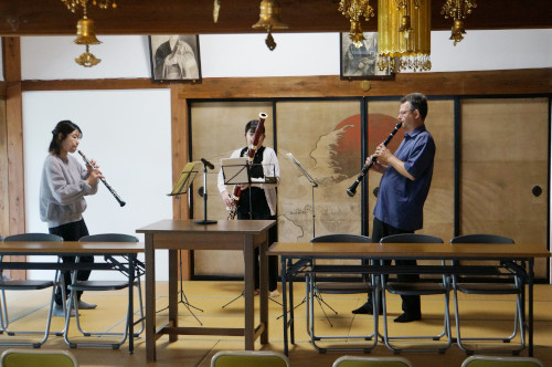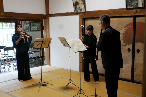 きのうは、職場でのコンサートでした。毎年この時期に開かれる、会員様の総会のアトラクションとして、さまざまなアーティストさんに出演していただいて楽しんでもらうという催しものです。最初の頃は、もっぱら私も参加していたフルートアンサンブルが出演していましたが、最近は私だけでなく、副社長の人脈で呼んだりしています。今回の方々も、最初はどこかの市民センターの情報を、副社長が持ってきたものでした。ただ、そのメンバーは私も知っている方々だったので、私が対応することになり、職場に来ていただいて打ち合わせを行ったのでした。 それが2020年の初めごろ、まだ世の中は普通の生活を送れていた頃でしたね。でも、その後、とてもコンサートなど開けるような状況ではなくなってしまい、ニューフィルの練習でも中止を強いられるようになってしまいましたね。ですから、その方々には「来年改めてお願いします」ということになったのです。 ところが、そんなに簡単にそれが収まることはなく、結局それから4年後になって、めでたく開催となりました。ただ、当初は東京から一人メンバーが加わることになっていたのですが、今回は地元で調達ということになりました。そうはいっても、代わりにお願いしたのが仙台フィルの首席奏者、真央さんですから、なんの遜色もありません。 その方はファゴット担当、そして、同じ仙台フィル首席のクラリネット、ダビットさん、そして、その奥さんのフリーのオーボエ、亜貴さんの3人が、出演者の方々です。トリオ・ダンシュですね。こんなチラシも作ってみました。 予定では、ご夫妻のご都合で午前中に用事があるので、リハーサルは朝に行いたい、ということでした。そこでまず、9時から、会場でリハーサルです。そこで皆さんを待っていたら、やってきたダビッドさんがいきなり「○○○サーン、この間のニューフィル、素晴らしかったですヨ」と、私に抱き着かんばかりに話しかけてきました。ニューフィルのコンサートにはよくいらしてるみたいですね。本当に気さくで明るい方でした。 ![]() 45分後には、ご夫妻は一旦帰られたので、真央さんは、木管で分奏の時に使っていた部屋の奥の茶室で一人で待っていることになりました。お昼にはお二人も戻ってきてお弁当を食べていただくのですが、それが届いたので持って行くと、しっかり楽譜を見ながら音源を聴いてましたね。 ![]() そして、1時半になったら会場の脇の書院に案内して、そこが楽屋代わり、本番まで待機していただきます。 ちょっと押し気味で開演の時間になったので、「楽屋」に出迎えに行きます。部屋を出ようとしたら、真央さんは、カーディガンを羽織っていたままだったので、あわててストラップを外してから、カーディガンを脱いだりしてましたね。あ、皆さん靴を履かれてはいませんが、これは忘れたのではなく、「畳を痛めたくない」という皆さんのご意向だったので、甘えさせていただきました。 ![]() ![]() ![]() お帰りになるときに、社長たちが呼び止めて、お茶を振舞っていました。私はこっそり本番の演奏を録音していたので、それをUSBに入れてから、そこに加わり、USBを渡しました。色々、オーケストラの話で盛り上がりましたね。なんでも、私が来る前には、ダビットさんは社長たちにも、私のフルートはお上手ですね、みたいなことを言っていたみたいですね。あ、お客さんの中には、ニューフィルの人も1人いらっしゃいましたよ。 |