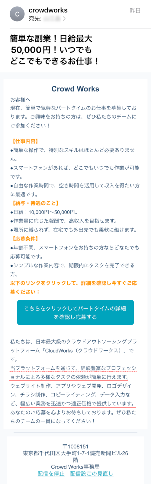 先日のWOWOWのメールは「本物」でしたが、きのうもこんな怪しげなメールが届きましたよ。 ![]() いや、そもそもこの住所、読売新聞ビルの26階というのは、「読売巨人軍」のオフィスですよ。そこでこんな怪しげな仕事をしているわけはないですよね。WIKIによれば、テナントとして貸し出されているのは19階から24階までだそうですし。 最近、そんな人たちが登場するちょっと昔の映画(「闇金ウシジマくん」)をWOWOWで見直したばかりなので、つい、疑ってしまいます。10年ぐらい前の映画なのですが、今見るとその頃のキャストが初々しいのが分かって、楽しめましたね。1作目では、林遣都と大島優子が出ていましたが、この二人はそのご結婚してましたね。4作目では、仲野太賀(当時は「太賀」)が出てましたね。前に見た時には、この人は全然知りませんでしたから、新鮮ですね。あとは、ちょっとした端役でも、その頃はキャバクラ嬢だったのが、最近では母親役で出てたりしてますからね(筧美和子/赤丸)。 ![]() |
