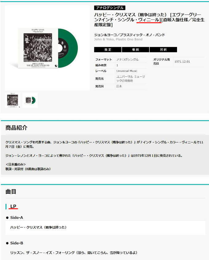 すでにSNSでは紹介してありますが、もう少し細かくこちらでも書いてみます。最近、ジョン・レノンが行ったコンサートの未発表音源などをまとめたボックスセットが発売されたそうですが、それと関連して、クリスマス・シーズンということもあってこんなものまでリリースされた、というものです。 ![]() それはもちろん、アメリカなどでの出来事ですが、日本でも、DJなどがレコードを使って音楽を作る「スクラッチ」という手法を導入したことで(この行為自体は、素手でレコードの溝の部分を持つという許しがたいものですので、私はとても嫌です)、レコードが再認識され、その時に「ヴァイナル」という言葉も広く知られるようになったのです。 それを、何ですか、「ヴィニール」って。もう一気に安っぽい家庭用品に成り下がってしまったではありませんか。 まあ、それは、もしかしたら単なる趣味の相違ということでかたずけられるかもしれません。しかし、この製品を「LP」と呼んでいることには、もう情けなくなってしまいます。普通だったら、こんなことを書いたらレコード会社を解雇されても仕方がないぐらいの、とんでもないミスですよ。 この「LP」という、それまでのレコードより長時間の演奏(=Long Playing)が可能という意味を込められたネーミングで「ヴァイナル」を素材としたレコードが作られたのは、1948年のこと。発売したのはアメリカのコロムビアでした。その時に制定された規格は、直径は12インチと10インチ、回転数は毎分33(正確には33 1/3)回転です。 それに対して、翌1949年には、同じアメリカのヴィクターが、直径7インチ、回転数が毎分45回転という「ヴァイナル」を発売します。これは、「シングル盤」と呼ばれています。 さらに、1952年には、ヴィクターがシングル盤と同じ規格で、演奏時間を延長させた「EP」を発売します(この件に関してのWIKIPEDIAは、相変わらずのでたらめを垂れ流しています)。 お分りでしょうか。今回発売された「7インチシングル」というレコードは、LPとは全く異なる規格によって作られているのですよ。 注意しなければいけないのは、LPなのに、シングル盤並みの45回転を採用した「45回転LP」というものは存在しますし、逆に、シングル盤のサイズで回転数が33回転の「コンパクトLP」というものも、かつては存在してました。ですから、これも、その「コンパクトLP」だったら、このコピーは全く問題はありません。 ![]() |