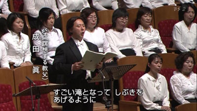 やっと少し暇が出来たので、それを見てみることにしました。そうしたら、なんだか見慣れた人がソリストで出演していましたね。そう、実はこれは半年ほど前に教育テレビで放送されたものと同じものだったのですよ。ただ、その時は1時間枠でしたからかなりのカットがあったものが、今回はしっかり全曲やってくれました。その時にも書いたのですが、その「見慣れた人」というのが、東京で毎年オペラシティでコンサートを開いている私の合唱団の、ボイトレの先生だったのですよ。今回じっくり聴いてみると、第2部のかなり長いソロも歌っていたのですね(当たり前ですが)。これが、とても堂々としていて、声も伸びているし、ちょっとすごいものでした。一緒にでていたベテランの歌手に比べて、全くひけをとらない存在感でしたよ。というか、その「ベテラン」が、実はもはや下り坂だったことが分かってしまったりして。