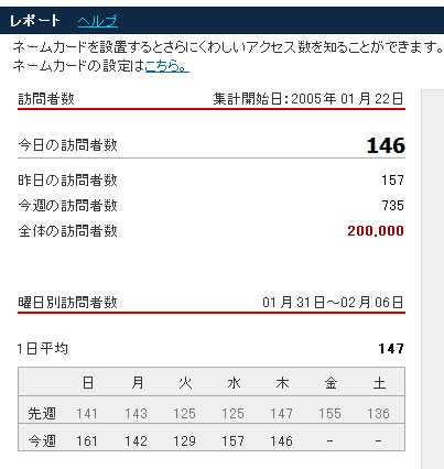 話は日本に戻って、私がカウンターにログインしたときにはたしか「199,992」でした。それから、他のサイトを覗きがてら「F5」を繰り返します。なんか楽しいですね。もしそこでカウンターが上がれば、その瞬間にブログに今日始めてきた人がいる、ということなのですからね。そんなわけで、夜中の11時ちょっと過ぎに、「200,000」となりましたとさ。
