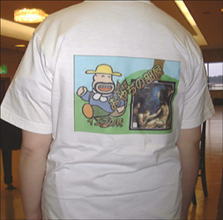 そんな折、前回の刃傷ざたの張本人、ヤスユキさん@びよ乱が、「おやぢ」のバナーでTシャツを作ってきてくれました。リニューアルオープンの記念だそうです。な、なんてバカなことを、と、一瞬たじろぎましたが、この温かい思いやりは必ずや執筆者にも届くことでしょう。不評などとはとんでもない。渋谷さん、あとでこのTシャツ送りますからね。