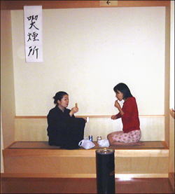 そんなこんなで、7時過ぎに東昌寺に着いたら、こちらも弦に負けず、かなりの人数が集まって、音出しをしています。Flパートの白百合コンビは、仲良く喫煙所でお食事中。大広間に集まったメンバーは、みな畳に座って楽器を吹いてました。考えてみたら、この会場で管全体の分奏をやるのは初めてのこと。椅子も用意しておいたのですが、遠慮して使ってなかったのですね。さっそく椅子を並べて、冷房も入れて、あとは練習指揮者の到着を待つばかりです。
