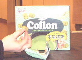 実は、この試合を見にわざわざ京都まで日帰りの新幹線で行って来た人が、団員の中にいたのですよ。掲示板にあるように、見事「八つ橋」を買って帰ってくることができたようで、これもおめでとうございます。そんなわけで、為サンのお土産の生八つ橋と、この近畿地方限定販売、宇治抹茶味の「コロン」で、練習後のホールは盛り上がったのでした。願い続けていれば、いつかは望みがかなうこともあるということですね。