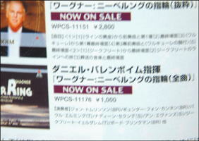 見えますか?「指環」全曲盤が「1,000円」ですって。あんまり安いので、すぐさま編集の人に、「これ、通販で買えますか?」とメールで聞いてしまいましたよ。そうしたら、すぐ、真っ青になって(顔は見えませんが)「21,000円のまちがいです。どうしよう。」という返事。いやぁ、大変ですね。ここで、編集者になり代わって、ワーナー様には深くお詫び申し上げます。しかし、まず、普通の人だったら笑って済ませてしまうことでしょう。どう考えても、「指環」全曲が1000円で買えるなどということはありえませんからね。