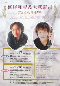 ステージに現れた瀬尾と大萩のいでたちは、いかにもセンスの良い若者という感じだった。黒のスーツに、黒っぽいシャツ。もちろん、ネクタイなどは締めてはいない。2人のシャツの色が微妙に異なっているというのが、なかなか心憎い演出である。見れば、ステージの上にはワイヤレスマイクのようなものが用意されている。ということは、演奏の合間に2人の肉声を聞くことができるいうことか。これはなかなか楽しみなことだ。それというのも、昨年、この2人が、なんと六本木のライブハウスでライブをやった時に、それを聴きに行った知人が「まるで掛け合い漫才のようだ」と話していたからである。大萩が「つっこみ」で瀬尾が「ぼけ」というか、ほとんど「うなづき」に徹していたというから、これは聞き逃せないではないか。