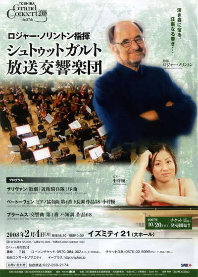 得体の知れないかつての東欧諸国のオーケストラが来ることはあっても、名の通った外国のオーケストラが訪れることなど絶えて久しくなかったこの東北の小都市に、久しぶりに立派なオーケストラがやって来ることになった。しかも、それはノリントンという一風変わった芸風の持ち主の指揮者の元で、今や大きな注目を集めるようになったあのシュトゥットガルト放送交響楽団というのであるから、これは何を置いても聴きに行くべきものであろう。評価は分かれるであろうが、それはなんと言っても現在のクラシック音楽の世界では、間違いなく最先端を行っている指揮者とオーケストラの組み合わせであるのだから。