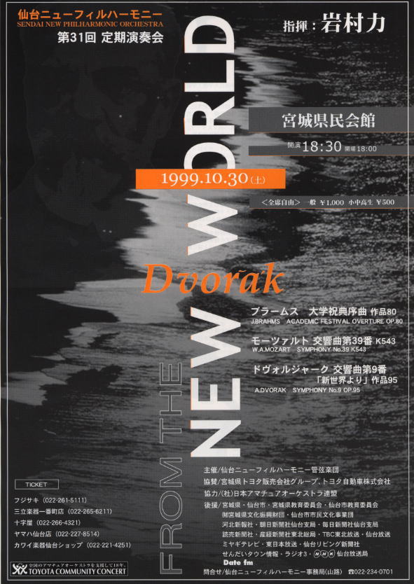 (ところで、和紀クンは、今度の演奏会のためにまたまた素晴らしいチラシを作ってくれました。で、じつは、これには私も一役かっているのです。先週の金曜日、本当ならもう帰っている時間で職場には居ないのですが、たまたまYUMIサンのためにCDをMDにダビングしていたら和紀クンから電話が来て、ポスター用の素材でドヴォルジャークの写真がいますぐ欲しいのだけれど、なんとかならないかというのです。もちろん、前にも書いたような性格の私ですから、手元にあったスコアからスキャンして、ただちにメール添付で送ってあげたことは言うまでもありません。背後霊のようにぼんやり写っている写真は、こんな風にして送られた画像なのです。)