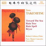 このアルバムには、ロバート・エイトケンというカナダ(四国のエヒメケンではありません)で活躍しているフルーティストが中心になった室内楽作品が主に収録されています。武満がフルートという楽器を好んでいたことはよく知られていますが、中でも、ここで「ヴォイス」、「巡り」、「エア」という、フルート1本だけのための作品3曲を並べて聴けるのは、武満の作風の変化を実際に耳で味わえる点で、非常に興味深いものがあります。1971年の作品である「ヴォイス」は、今でこそ多くの演奏家によってリサイタルのレパートリーとして取り上げられることが多くなっていますが、作られた当時は、初演者のオーレル・ニコレという、そのころの現代音楽のスペシャリスト以外には演奏不可能とさえ思われた、超難曲だったのです。楽譜には見慣れた普通の音符などは一切書かれておらず、しかもフルート奏者は楽器の音だけではなく、自分の声で叫んだりつぶやいたりすることが求められるという、まさに「アヴァン・ギャルド」そのものでした。それが、1989年の「巡り」になると、確かに重音(同時にいくつかの音を出す奏法)やホイッスル・トーンといった、特集奏法の名残はありますが、曲自体は普通に歌うことの出来るリリカルなメロディーを持つようになります。これは、ポーラ・ロビソンという、ロマンティックが信条のフルーティストからの委嘱という事情もあるのでしょうが、確実に武満自身の作風の変化として、遺作となった1995年の「エア」への道へとつながっていくのです(実際、「巡り」と「エア」というこの2曲、どこか1カ所を取り出して聴いてみると、即座にはどちらかとは答えられないほど、よく似ています。そんなことを言ったら、彼の作品は全部同じではないか、などとは、分かっていても決して言ってはなりません・・・)。