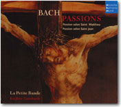そのアーノンクールが移籍した先のBMGでは、定評のあるDHMレーベルのラ・プティット・バンドの「マタイ」と「ヨハネ」がセットになって、こちらは3690円というお買い得なお値段を提供していたので、まだ持っていなかった私は早速ゲットしてしまいましたよ。特にレオンハルトの「マタイ」は各方面で評価の高いものですから、いつかは聴いておきたかったものでした。しかし、このアルバム、残念ながらそれほど感銘を受けることはありませんでした。何よりも失望させられたのは、合唱の女声パートを歌っているテルツ少年合唱団のあまりのひどさ。音程は定まらないし、声は弱々しいし、児童合唱の悪い面ばかりが表に出てしまった悲惨なものでした。なぜか、ソロの女声もここの団員が歌っているのですから、それがどんな結果を生んでいるか、おわかりになることでしょう。もう一つ、レオンハルトの、コラールを演奏するときに各拍にアクセントを付けるという変な癖も、今聴いてみると著しく全体の流れを損なう、みっともないものでした。その点、同じセットのクイケンの「ヨハネ」は、すっきりした自然な流れがとても美しい名演です。