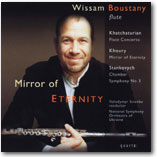 「永遠の鏡」というタイトルのこのアルバム、レバノンの作曲家Houtaf Khoury(なんと読むのでしょう)が作った同名の曲の他に、ハチャトゥリアンのフルート協奏曲と、ウクライナのスタンコヴィッチという人の「室内交響曲第3番」(実質的にはフルート協奏曲)の3曲が収められています。演奏しているのは、レバノン生まれで、現在はロンドンを中心に活躍しているフルーティスト、ウィッサム・ブースタニーと、ウクライナ生まれの指揮者シレンコに率いられたウクライナ国立交響楽団という、ローカリティあふれる顔ぶれになっています。レバノン、ウクライナ、そしてハチャトゥリアンのアルメニアと、いずれもヨーロッパとアジアの境目に位置する国々の、特異な民族性を持った音楽たち、それを、西洋音楽に慣らされてしまった耳へのひとときの刺激剤としてこのアルバムを求めたのであれば、あなたはここで聴くことの出来るとてつもないメッセージに、殆ど圧倒されてしまうことでしょう。そう、まさに私自身が、とりわけハチャトゥリアンに込められた「思い」の大きさに、呆然となっているところです。