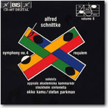 80年代から進行していたBISによるシュニトケ全集、20巻目にあたる交響曲6、7番を最後にしばらくリリースがなかったので、てっきりそれで完結していたと思っていたら、久しぶりに21巻が登場です。この全集、ジャケットのデザインがアルフレート・シュニトケの頭文字「AS」を音名で表すという、ユニークなものでした。そもそも、このシリーズのロゴマークがその「A」つまり「ラ」と「S」つまり「Es=ミ・フラット」をかたどった(下のジャケットの右上)、あまりセンスの良くないものなのですが、ジャケット自体も、音符と五線紙を黒字に赤や緑の原色を使って配するという、ちょっと安っぽいものだったのです。