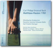 少年合唱の初々しさが心地よい1781年ものを演奏しているベリンガー盤、そして、いかにも「大人」の演奏を聴かせてくれる1785年もののダウス盤、いずれの曲も、ちょっと聴いてみるだけですぐ分かるのですが、大バッハ版「マタイ」からの引用が数多く見られます。殆どのコラールは聴いたことがあるものですし、劇的な場面で使われる合唱も、あの印象的なフーガがそのまま使われているのですから。そして、どちらの曲でも、最後はあの印象的な受難コラール「O Haupt voll Blut und Wunden」で締めくくられるというもの。まさに大バッハ版のダイジェストといった趣です。思い切り痩せたと(それは「ダイエット」)。ベリンガー盤のライナーにはきちんと注釈があるのですが、その間の合唱やアリアなども、実は殆どエマニュエルのオリジナルではなく、別の作曲家の引用であることが分かります。しかし、ここぞというところに、紛れもなくエマニュエルの個性がしっかり表れたアリアなどが挿入されているのは、嬉しいものです。