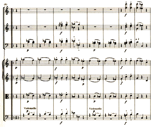 従来版(上)と、原典版(下)を比べてみて下さい。従来版では2拍目からfの指示ですが、原典版では1拍目からすでにfになっています。この違いは、このCDのようにきちんと楽譜通りに演奏されたものを聴いてみると、はっきり分かるはずです。リズム感が全く異なって、まるで別の音楽になっていることに気づくことでしょう。今まで聴いてきたものはいったい何だったのか、もしかしたら、「まさにこれこそが、ベートーヴェンが伝えたかったものなんだ!」と叫んでしまう人もいるかもしれないほどの衝撃です。というのも、今までに出ていた「原典版」による演奏で、ここまで徹底して楽譜の指示に従っていたものは殆どなかったからなのです。あのノリントンなどは、「ベーレンライター版」(譜例はヘンレ版ですが、中身は同じです)と謳っているにもかかわらず、この部分は従来版の指示で演奏しているのですから。