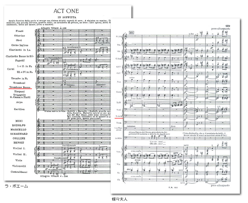 ちなみに、プッチーニの場合は最初から「Trombone basso」と書いてあります。「ラ・ボエーム」はともかく、「蝶々夫人」ではこの楽器が初めて現れるのが、下のスコアのように139ページ、第1幕全体では10小節ほどしか出番がありません。そういう意味で、この作品は「チンバッソ殺し」と呼ばれているのだそうです。