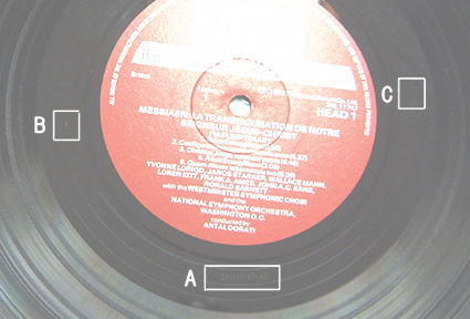 写真にあるLPの番号を見てみましょう。レーベルの真下【A】がマトリックス番号です。「ZAL-11747-4G」のうち、「ZAL」はステレオ、「11747」は音源、この場合は2枚組、4面からなるドラティ指揮のメシアンの「わが主イエス・キリストの変容」の第1面をあらわします。最後の「4G」は、4回目にカットされたラッカー・マスターであることをあらわします。ちなみに「G」というのはカッティングに当たったエンジニアのイニシャルだそうです。また「4回目」とは言っても、これはカッティングを4回行ったということで、必ずしも実際に製造に使われたラッカー・マスターの4枚目のものという意味ではありません。レーベルの左側【B】には「1」という刻印があります。これは、その4枚目のラッカー・マスターによる、1番目のメタル・マザーが使われたということです。そして、右側【C】に刻まれているのは、ちょっと分かりづらいかも知れませんが「K」という文字です。これは、そのメタル・マザーからの4番目のスタンパーであることをあらわしています。なぜ「K」が4番目なのかは、参考サイトを参照してみて下さい。