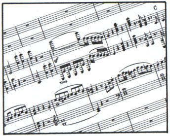 この曲は、どうやらヨハン・シュトラウスのワルツ、「美しく青きドナウ」のようですね。しかし、楽器を見てみると、なんだか見慣れないものがありませんか?「A.Saxes」とか「T.Sax」、シュトラウスの時代に「アルト・サックス」や「テナー・サックス」などと言う楽器がありましたっけ。それと、上の方の段は木管でしょうが、調号が何もありません。「青きドナウ」は、確か冒頭でフルートがF♯をppで吹かなければならない難所があったような記憶がありますから、ハ長調ではなかったような気がするのですが・・・。そう、これはどうやら吹奏楽用に編曲した「青きドナウ」のようなのですね。それだったら、サックス族が入っているのも納得ですし、調号の問題も、おそらくシャープ系は吹きずらいので、簡単なハ長調に移調したのでしょう。となると、シンフォニー・オーケストラの指揮者(もちろん、それはこの前後の話で明らかです)を目指している真一が後生大事に隠し持っていたものは、吹奏楽用のスコアということになりますね。これはちょっと不思議。