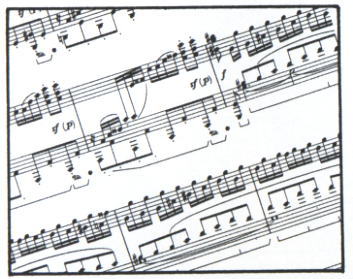このシーンには、もう一つ不思議な楽譜が登場しています。真一は本当は指揮者を目指しており、ピアノのレッスンなど受ける気はさらさらありません。そこで、レッスン室にもオーケストラ曲のスコアを持ち込んできています。ハリセン先生が、そんな真一のやる気のない態度に業を煮やして「なーにやっとんじゃー ゴルァ!!」と、手に持ったハリセンで真一の横っ面を張り飛ばすと、勢い余って譜面台の上の楽譜が床に落ちます。そこで、レッスン曲(とりあえず「月光」)の下から、そのスコアが出てきて、さらに怒りを買うというシチュエーションになります。そこで、15ページ目にはそのスコアの中身が描かれています(これはもちろん現物を表したもので、先ほどの「音」を示す描写とは微妙に異なる「文法」です)。