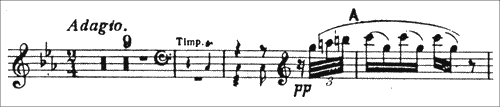 全音版のスコアでは三十二分音符になっています。念のため参照した「プラハ版」でも、同じく三十二分音符です。もちろん、KALMUS版のパート譜も三十二分音符。もっと言えば、かなり初期の印刷譜が種本になっていると思われるドーヴァー版でも三十二分音符。ところが、アーノンクールはバイノン嬢にここを三連符で吹かせているのです。(譜例参照)