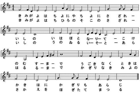 君が代は ちよにやちよに さざれいしの 巌となりて こけのむすまで うごきなく 常盤(ときは)かきはに かぎりもあらじ