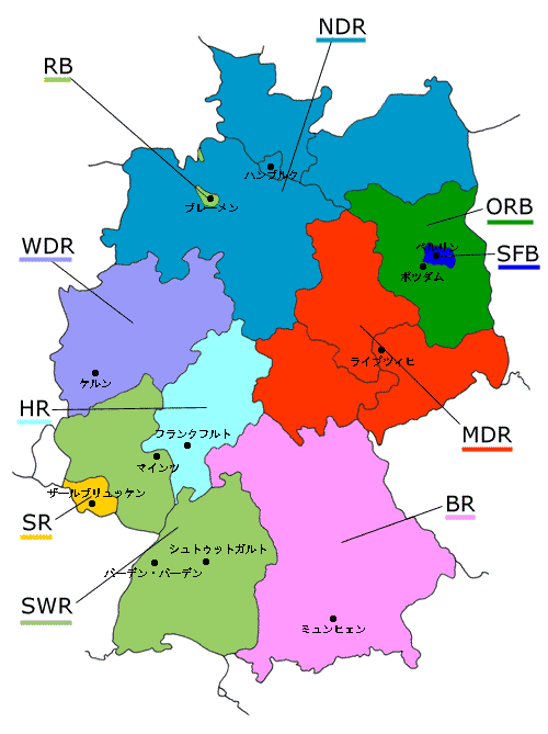 そのような地方分権の土壌の上に、放送局も各州をサービスエリアにした、全部で10の公共放送(正式には「公共法放送 Öffentlich-rechtlicher Rundfunk」といいます)があります。それを色分け表示してみました。黒丸は放送局の所在地、州都とは微妙に異なっているところもあります。注意したいのは、このエリアが複数の州にまたがっていることもあるということです。また、放送局の統廃合も行われてきており、これはあくまで現時点でのエリアです。さらに、これらを統合する形で「ドイツ放送施設作業共同体 ARD/Arbeitsgemeinschaft der Rundfunkanstalten Deutschlands」という組織があり、「第一ドイツテレビ Erstes Deutsches Fernsehen」という全国放送を行っています。さらにもう一つ、「第二ドイツテレビ ZDF/Zweites Deutsches Fernsehen」という、公共の全国放送もあります。「ZDF」というのも、よく音楽の映像で目にしますね。