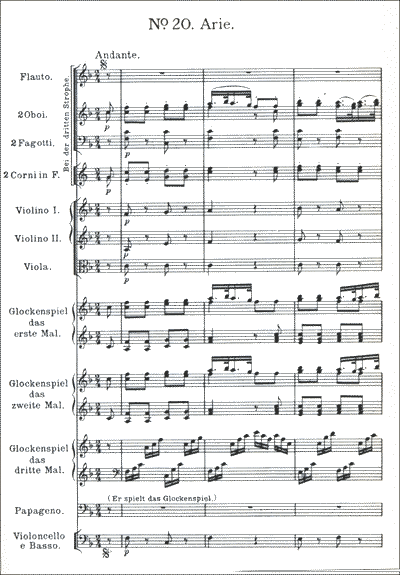 これが、その「恋人か〜」のスコアの最初のページです(この画像はペータース版ですが、「新モーツァルト全集」のベーレンライター版も内容は同じです)。その「鈴の音」を出す楽器は、「Glockenspiel」とありますね。グロッケンシュピールといえば、「グロッケン」ともいいますが、あの「鉄琴」ですよね。スタンドも何もついていないかわいい楽器、オーケストラでも良く使われますね。