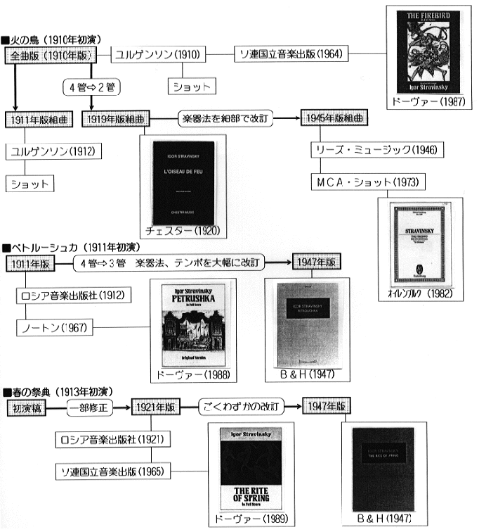 これ以外にも、他社が過去に出版していたものがいくつか確認できていますが、 (例えば、「火の鳥」の1910年全曲版がBroude Brothers社と全音、「春の祭典」も全音など) 複雑になるので省略したいと思います。