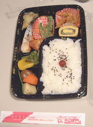 恒例、お弁当の写真です。左は前日の夕食。なぜか「こばやし」でした。右は当日のお昼で、こちらは地元の「めいじ」です。おかずは「こばやし」、ごはんは「めいじ」というのが、一致した評価でしょうか。 |